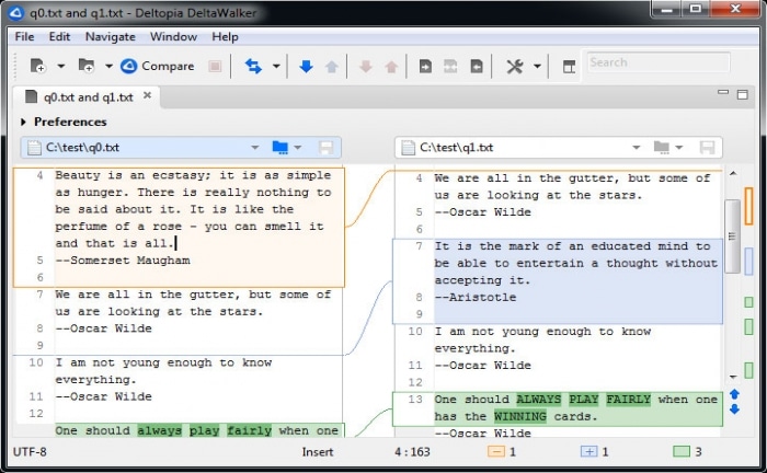 Programmet lar deg sammenligne ulike versjoner av en tekstfil, med visuelle referanser som gjør det raskt å identifisere forskjeller eller overføre endringer fra én fil til en annen. Du kan hente filer fra en lokal harddisk eller eksternt via FTP, SFTP, HTTP eller HTTPS. Du kan også sammenligne mapper og se hvilke filer som er forskjellige eller på andre måter avviker, basert på filstørrelse eller endret dato.